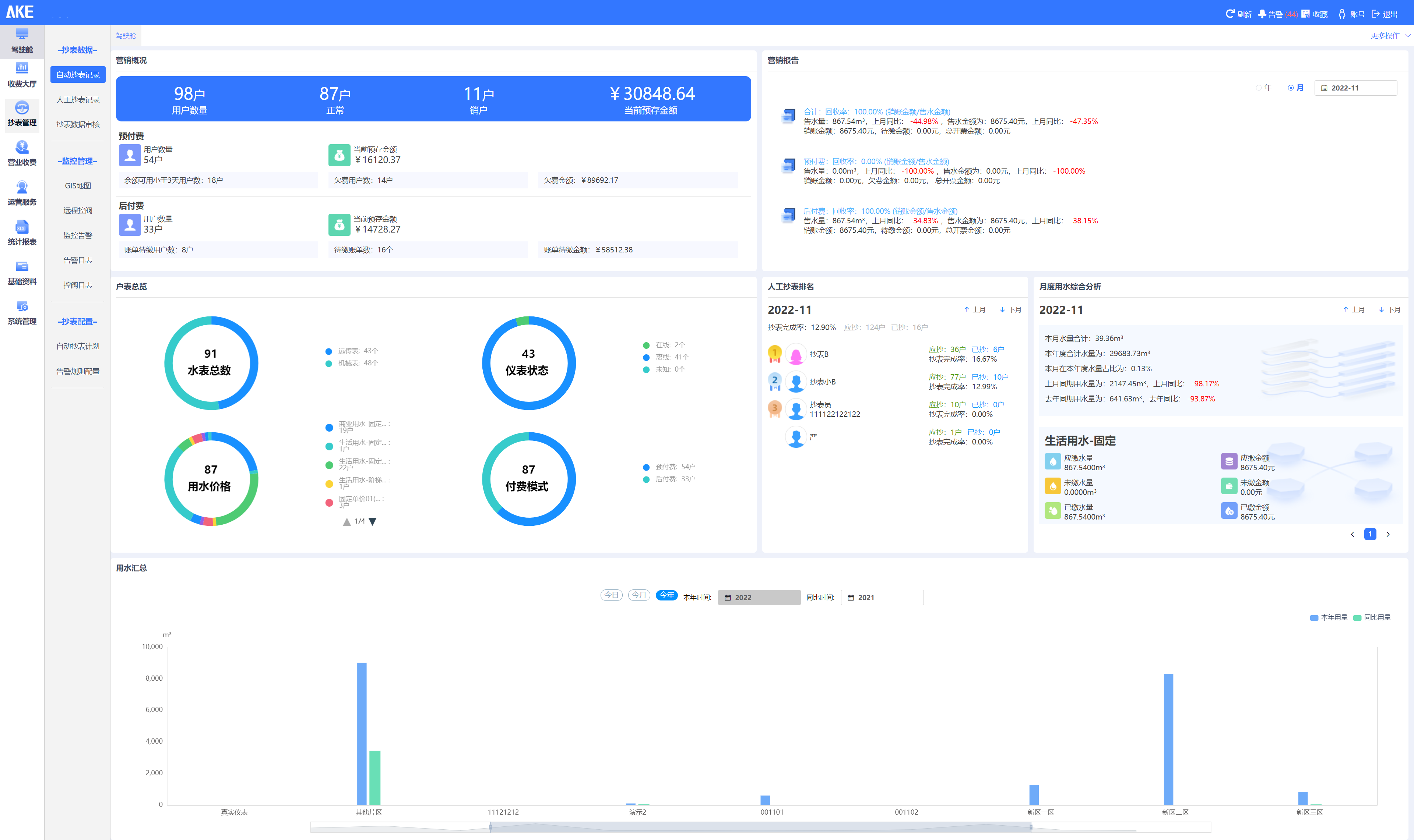 实现大用户用水、居民用水、工业用水、商业用水等场景的水表统一管理,对智能水表、远传水表、机械水表等表具厂家的类型、时间、用水量等数据进行多维度分析。