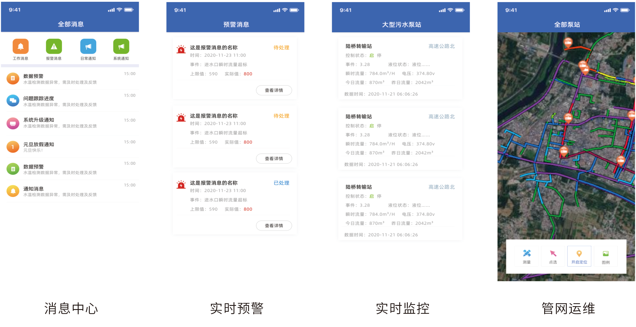 基于管网智能化建设,通过艾水务APP在移动端实现定制化功能整合,方便管理和运营,实现整个水务集团移动端管理平台,包含水厂、管网、营收等数据综合在线监管,以及统一外业管理平台。