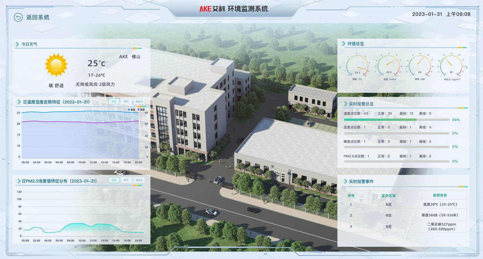 环境监测系统 对工厂车间的温湿度,生产线的废气、烟气等环境参数进行集中监视与预警,平台可根据选择的时间、区域自动生成温湿度曲线图、环境参数对比图等可视化图表。 |