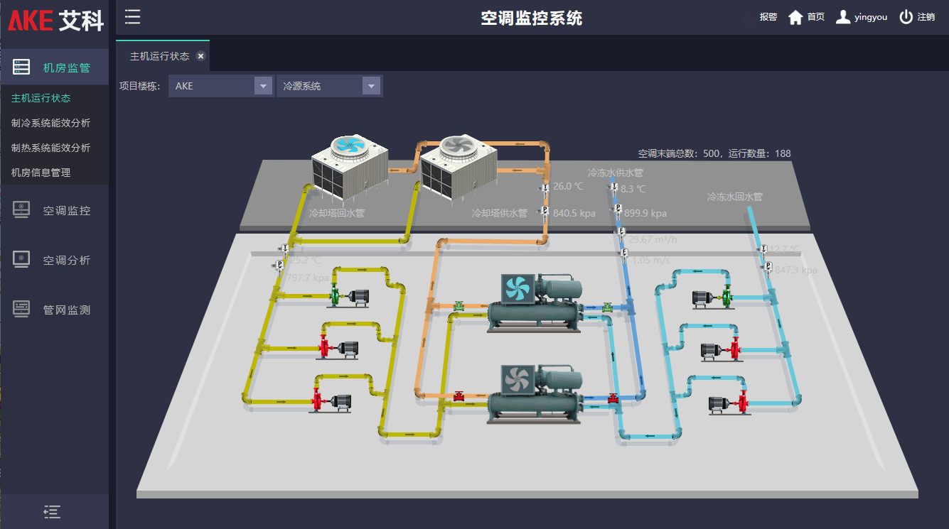 对建筑中的主要设备建立通讯并进行可视化展示,实现智能控制。通过系统平台可以对设备进行远程集中管理,如对不同区域空调进行启停、温度设定、模式设定等操作,实现精准控制,减少能耗浪费。
